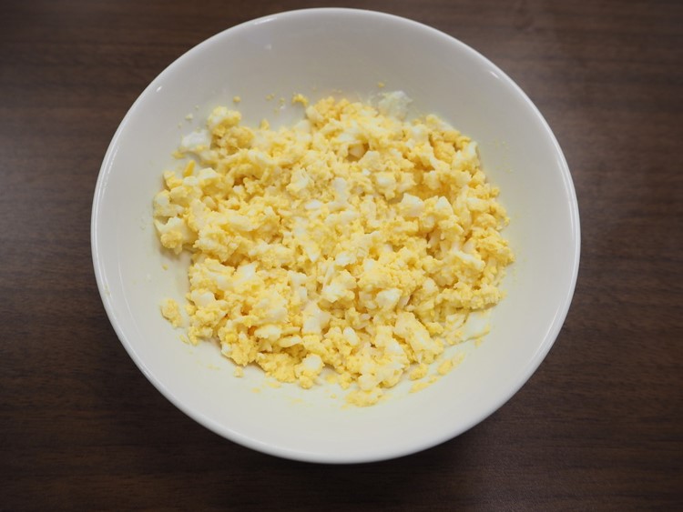 加熱したたまごは水分を捨て、フォークで細かく潰す。きゅうり・玉ねぎをみじん切りにしたものを入れてキッチンペーパーで水けをきる。